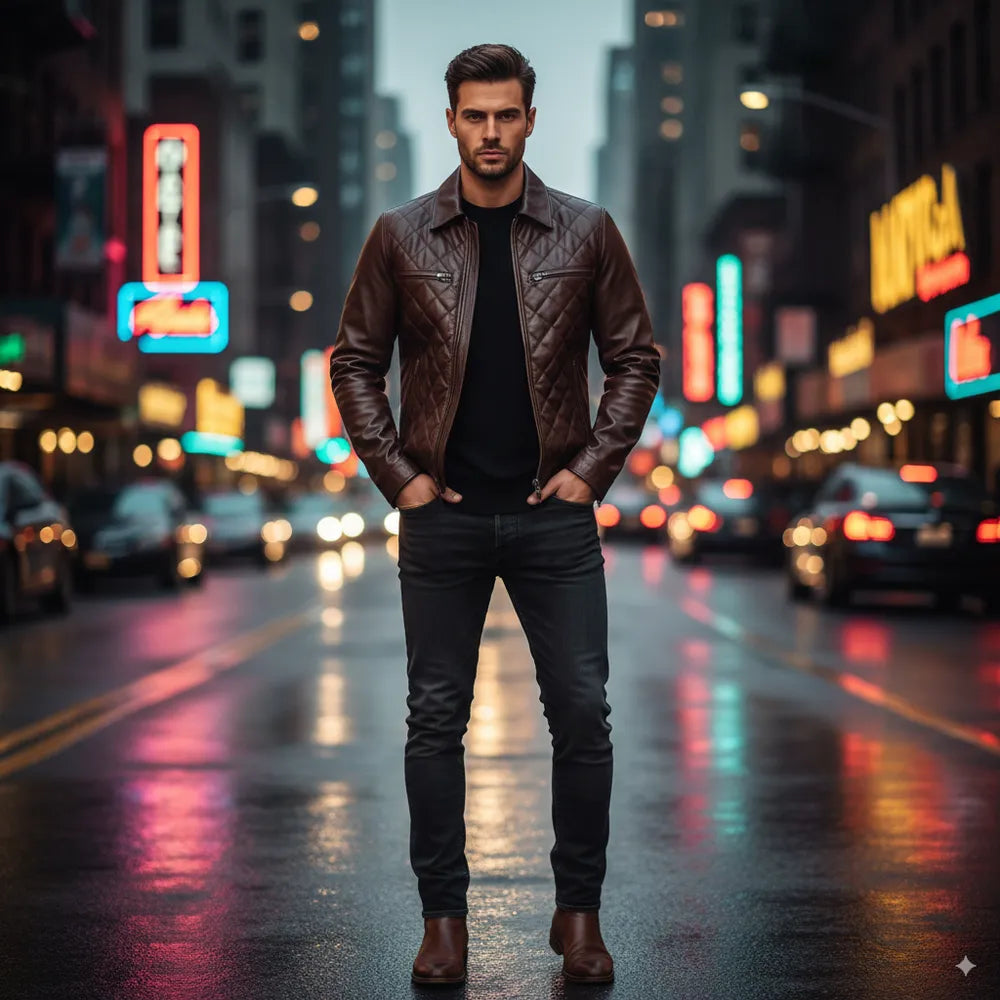 Men's Faux Shearling Quilted Brown Bomber Leather Jacket
