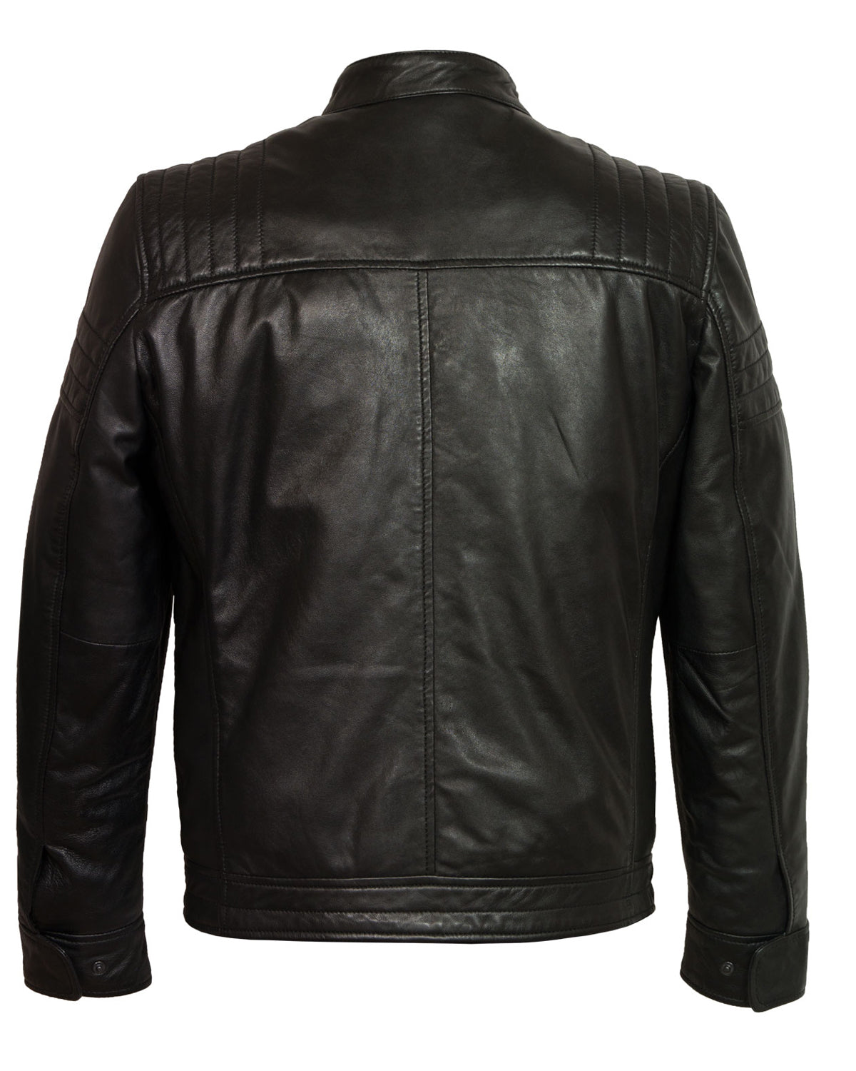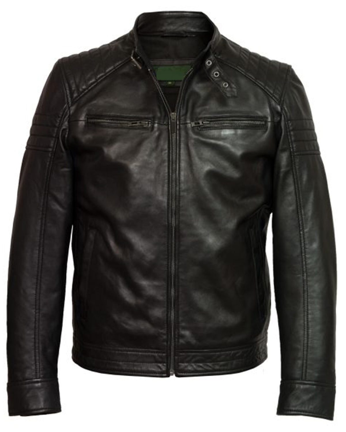 Designed in black color and made from leather, the lining inside is viscose lining, stand-up collar, open cuffs, zip fastening and inside & outside pockets.