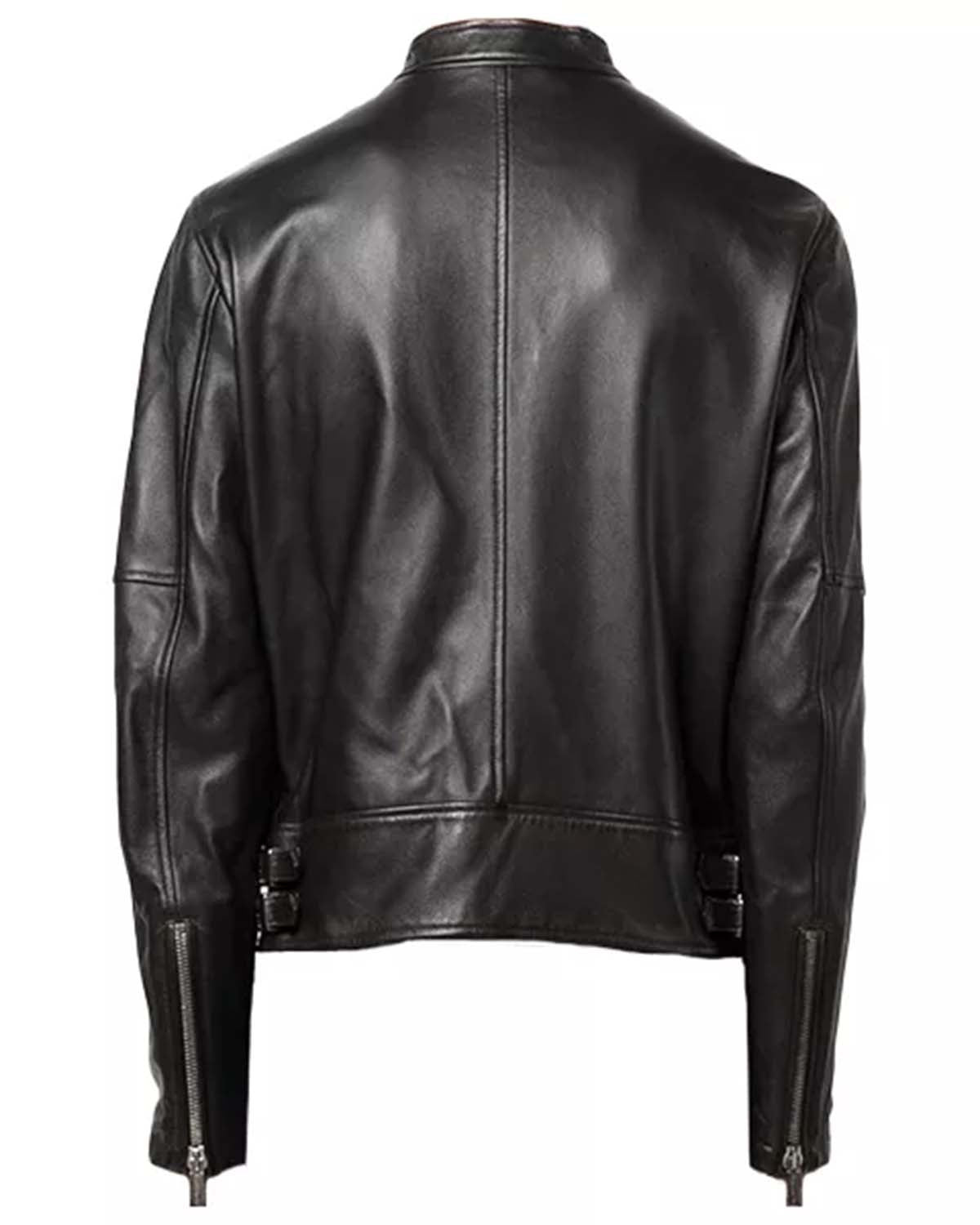 The black leather racer jacket also contains full sleeves and a snap-tab collar for a sleek look. Its design is enhanced by an adjustable belted waist, allowing you to achieve a tailored fit. This jacket combines timeless style with functionality, making it a versatile addition to any wardrobe.