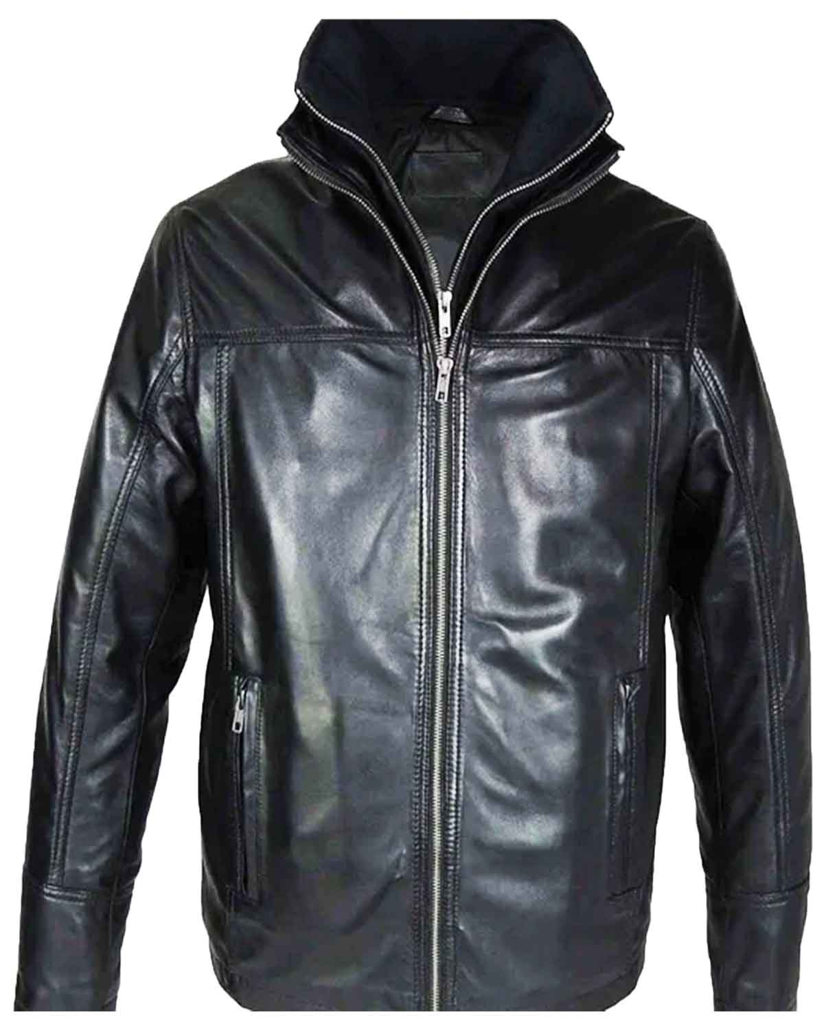 Discover the allure of this unique black double collar jacket for men, showcasing a modern and timeless aesthetic. Meticulously crafted from high-quality leather in a deep black hue, this jacket stands out with its unique double-neck shearling collar, adding a touch of individuality to your look.