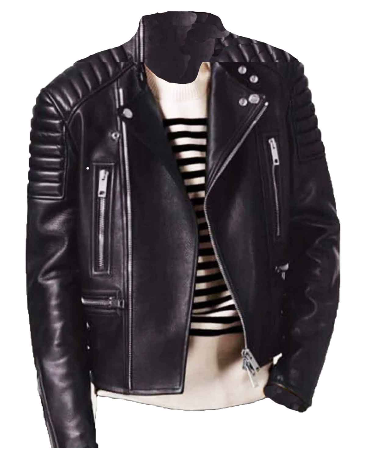 Elevate your biker style with the Men's Padded Shoulders Asymmetrical Black Bikers Padded Jacket. Crafted from real leather, this jacket not only adds a rugged edge to your look but also guarantees durability. The asymmetrical zipper closure at the front adds a modern and dynamic touch, setting you apart in the world of biker fashion.