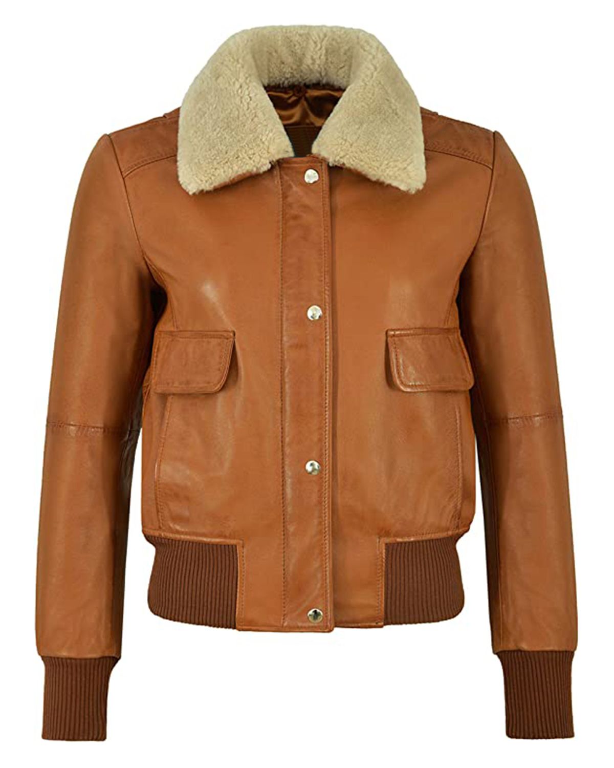 Introducing our Women's Bomber Jacket in a timeless Tan Brown color. Crafted from genuine sheepskin leather, this jacket exudes elegance and durability. The front stud snap button closure provides a secure and stylish look. Stay comfortable with the cozy polyester lining inside. With two outer side pockets, you can keep your essentials close at hand. The jacket features full sleeves and rib-knit cuffs and waist for added warmth and style. Plus, the detachable fur collar allows you to customize your look to suit any occasion. Elevate your fashion game with this versatile and chic bomber jacket, perfect for women with discerning taste.