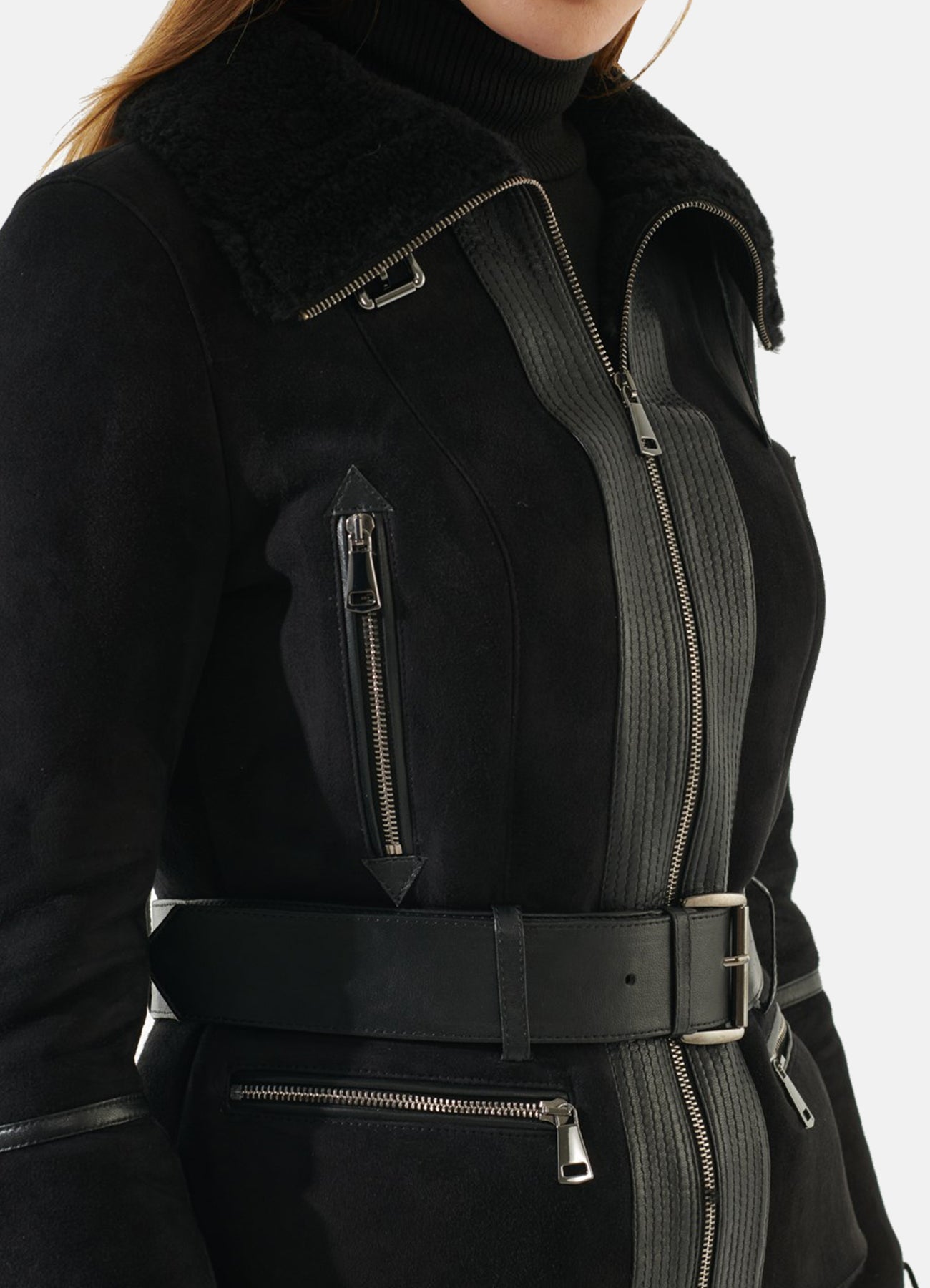 Womens Jet Black Suede Shearling Leather Jacket