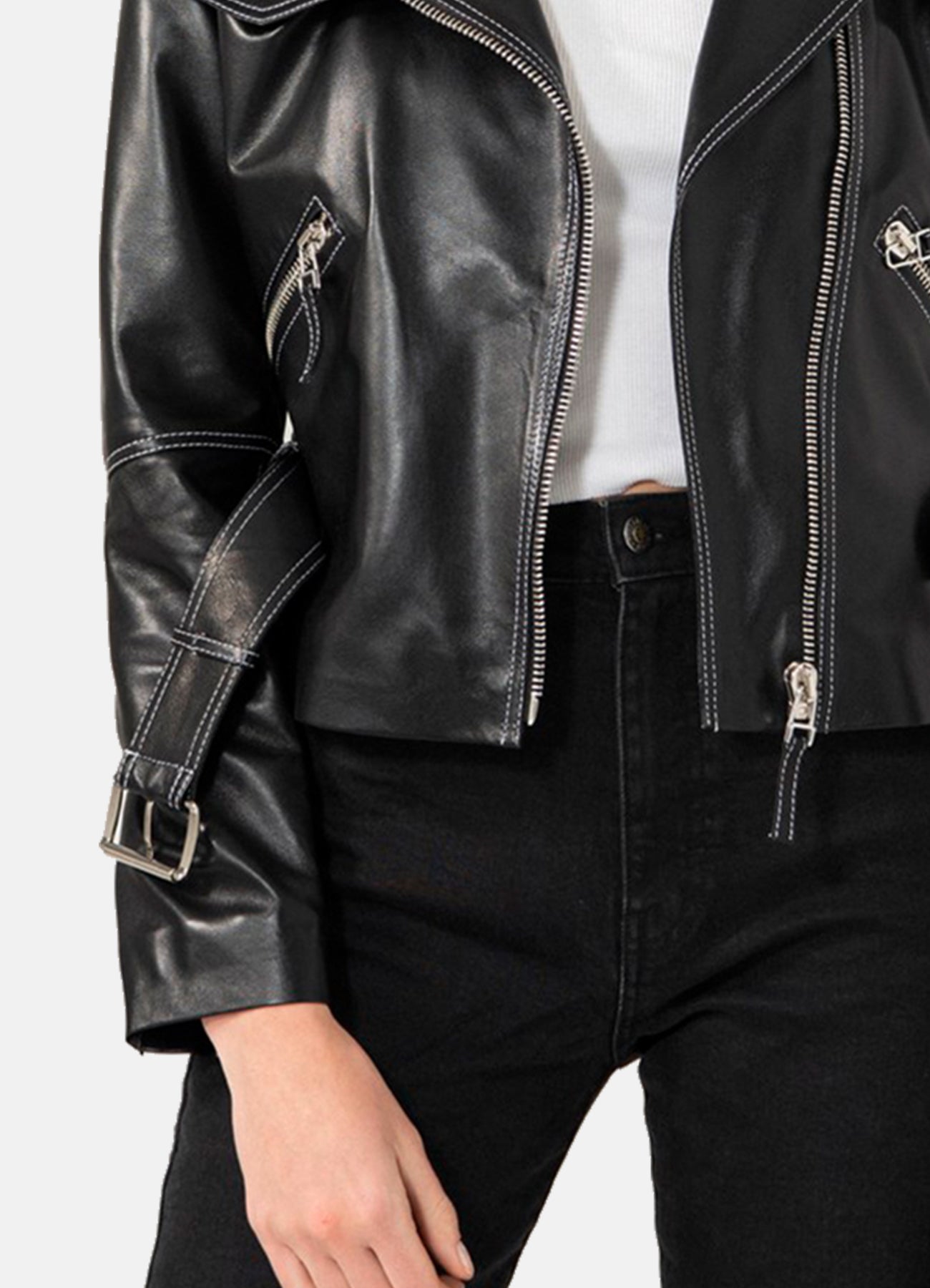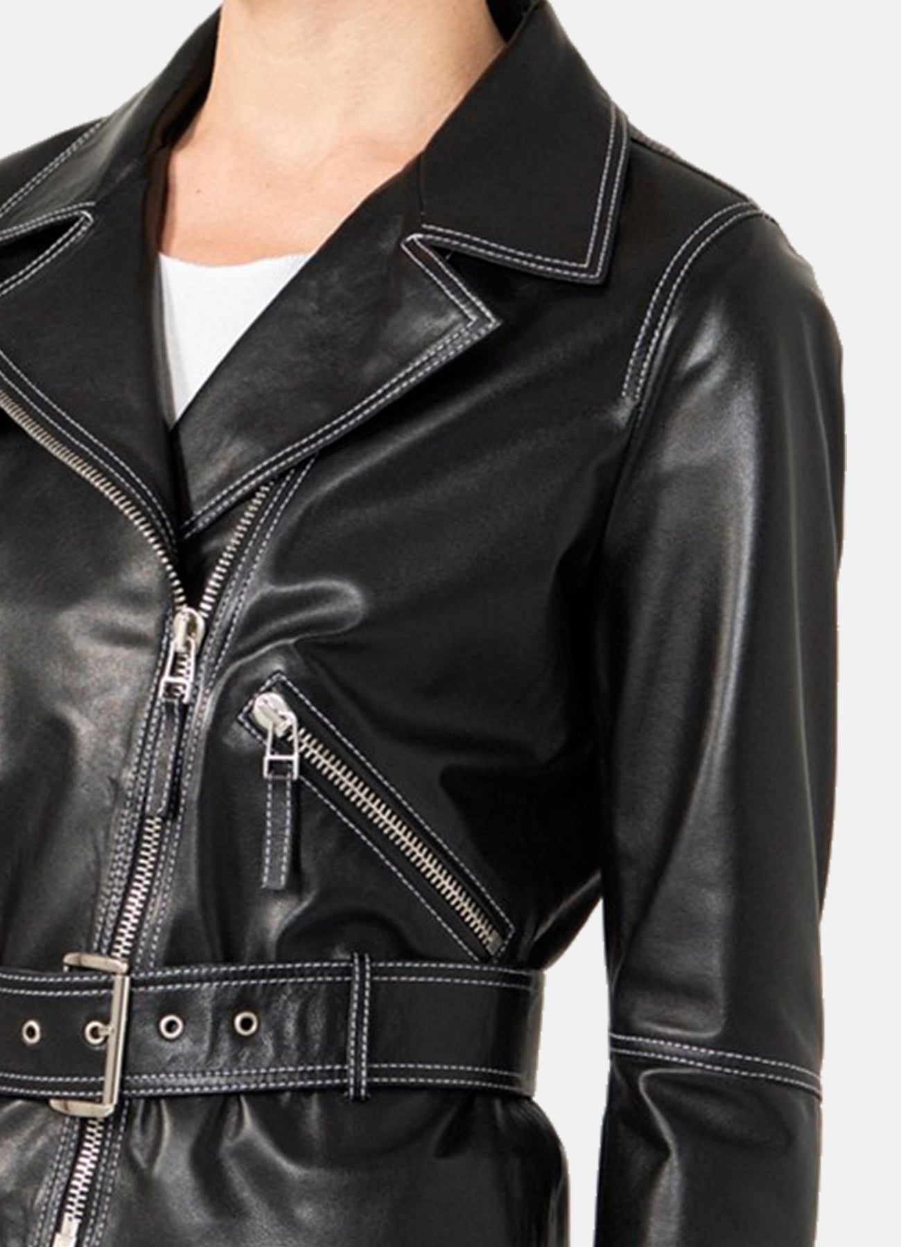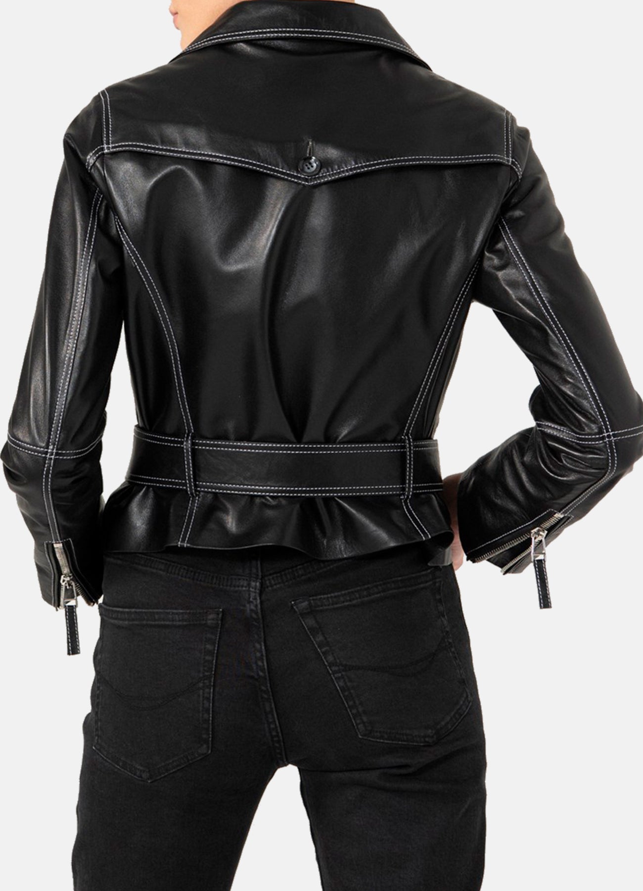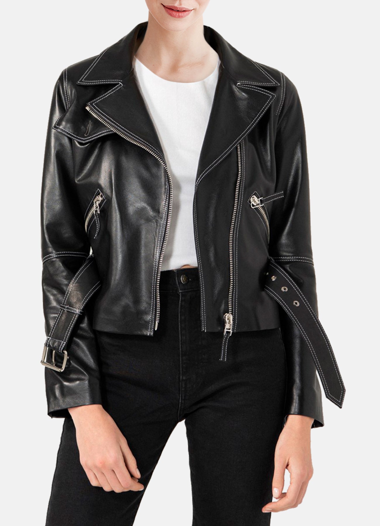 Womens White Stitched Black Biker Leather Jacket